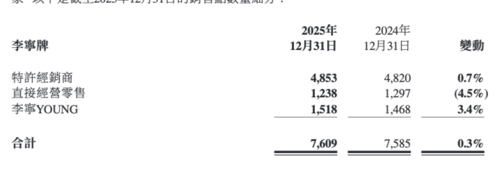 截至去年底,李宁牌(包含李宁核心品牌及李宁YOUNG)常规店、旗舰店、中国李宁时尚店、工厂店、多品牌集合店的销售点数量为7609家,同比净增加24家。其中,李宁YOUNG销售点数量共计1518家,同比净增加50家;李宁品牌门店6091家,同比减少26家。