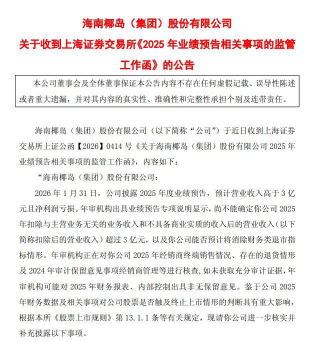 3月18日,*ST椰岛(600238.SH)公告称,近日收到上海证券交易所下发的监管工作函。该函件重点关注公司2025年业绩预告,核心质疑点在于:年审机构无法确定公司扣除后营业收入是否超过3亿元,以及能否消除财务类退市指标。上交所要求公司就退货具体情况、收入确认合规性、四季度收入同比大幅增长的原因等事项进行补充披露,并提示退市风险。公司表示正在组织对工作函要求的事项进行核实,并将按时回复。